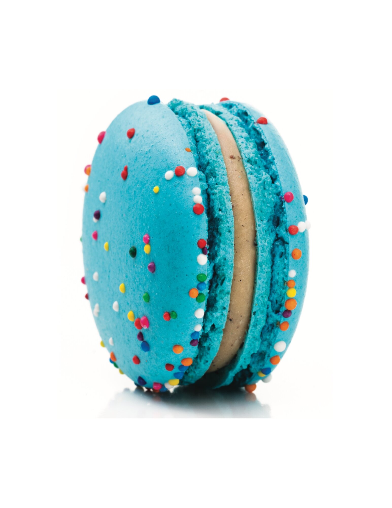 Two blue-colored almond macaron shells covered in sprinkles and filled with a vanilla cream. Gluten-free.