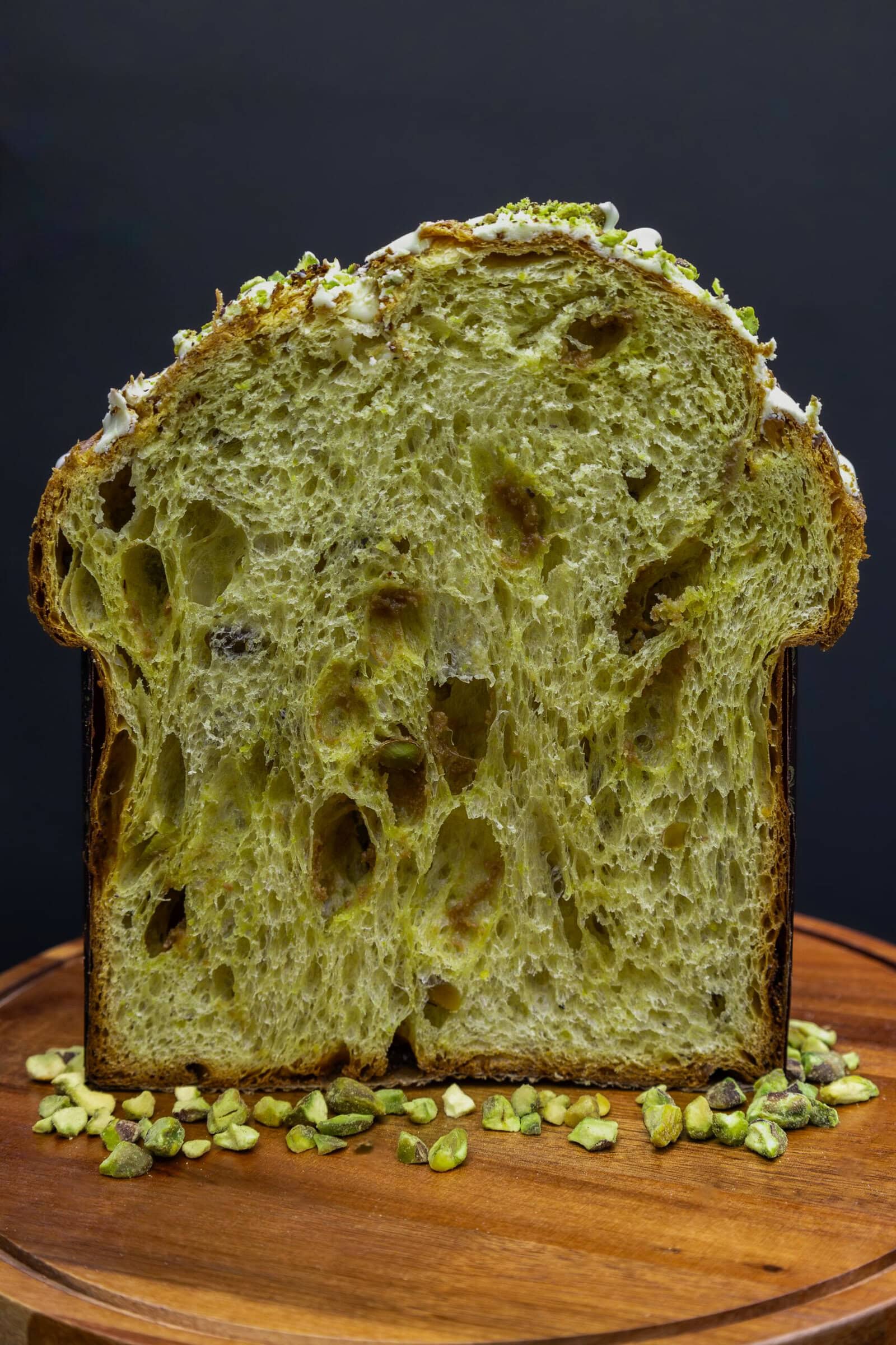 100% sourdough Panettone made with Italian imported Panettone flour, eggs, honey, house-infused butter, vanilla beans, pure pistachio paste, pistachios, and white chocolate.
